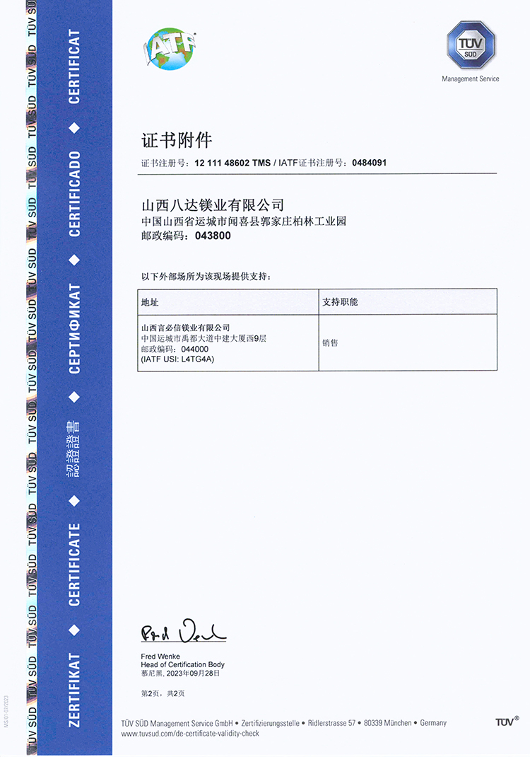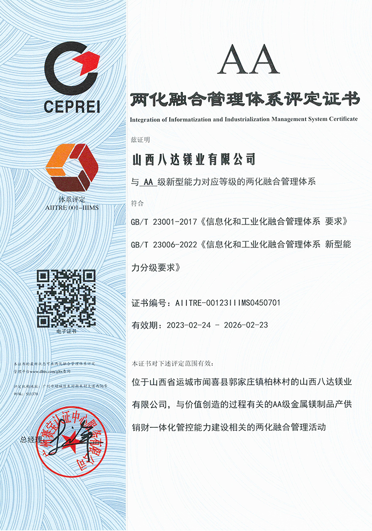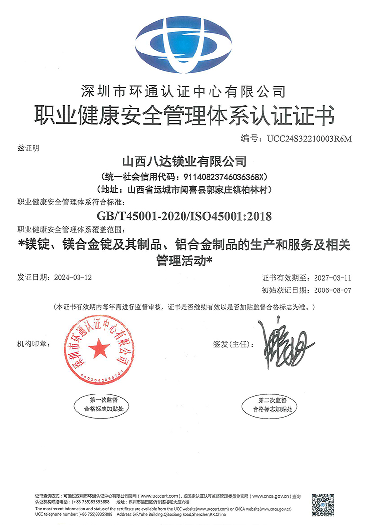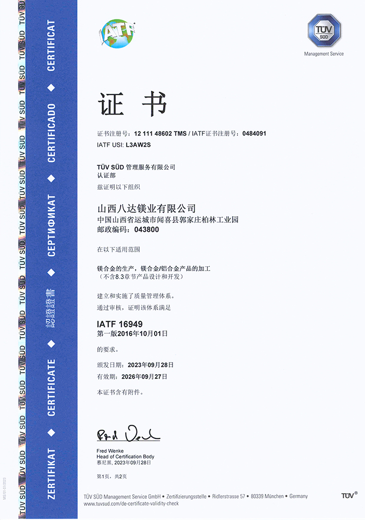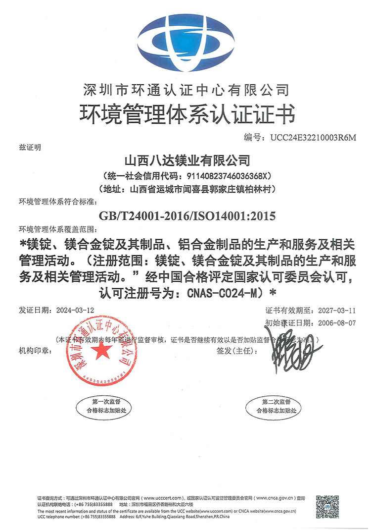 公司陆续通过ISO 9001:2015、ISO 45001:2018、ISO 14001:2015、IATF 16949: 2016及SCS认证,产品严格执行GB/T、ISO及ASTM等相关产品标准。八达技术中心检测设备完善,在技术分析、工艺优化、质量监控等方面全部实现了微机化管理,配备有直读光谱仪、ICP光谱仪、盐雾腐蚀试验箱、微控电子拉力试验机、数码金相显微镜、全自动布氏硬度计等全套先进检验设备,全流程严格执行质量管理体系标准要求。公司秉承“客户至上,质量为先”的服务理念,以优质的产品、完善的服务、过硬的质量赢得了国内外客户的信赖和赞誉。